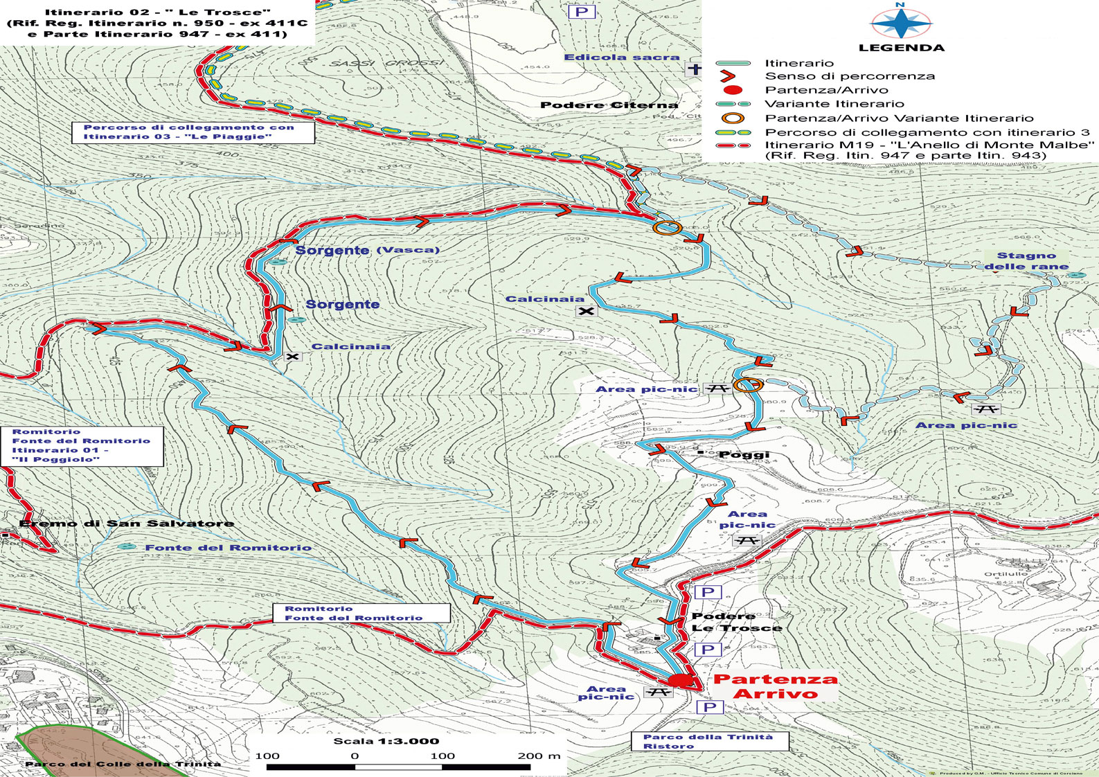 COME RAGGIUNGERLO: Si consiglia di iniziare l’escursione dal “Podere Le Trosce”, raggiungibile da Via Cerruti, ovvero la strada che conduce dal Colle della Trinità ai Cappuccini di Monte Malbe. Venendo dal borgo di Corciano, si sale per Via Panoramica sino a raggiungere la vetta del monte: il Colle della Trinità. Subito dopo il parcheggio del Colle, quando si ricomincia a scendere, si prende, sul lato sinistro della strada, facendo una curva a U, un sentiero sterrato (Via Cerruti) che, passando per castagneti e campi incolti, arriva ad un’antica casa poderale, sita a sinistra della strada bianca, nei pressi della quale si può parcheggiare per intraprendere l’Itinerario, ivi indicato dall’apposito tabellone segnaletico.