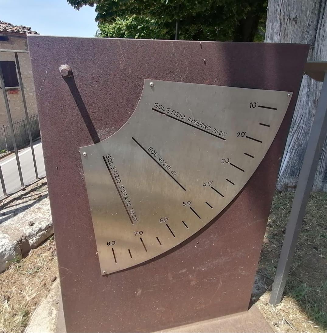 Sui lati del Plinto sono riportati i gradi di Altezza massima (Solstizio Estivo), media (Equinozi) e minima (Solstizio Invernale) del Sole alla Latitudine di Corciano.