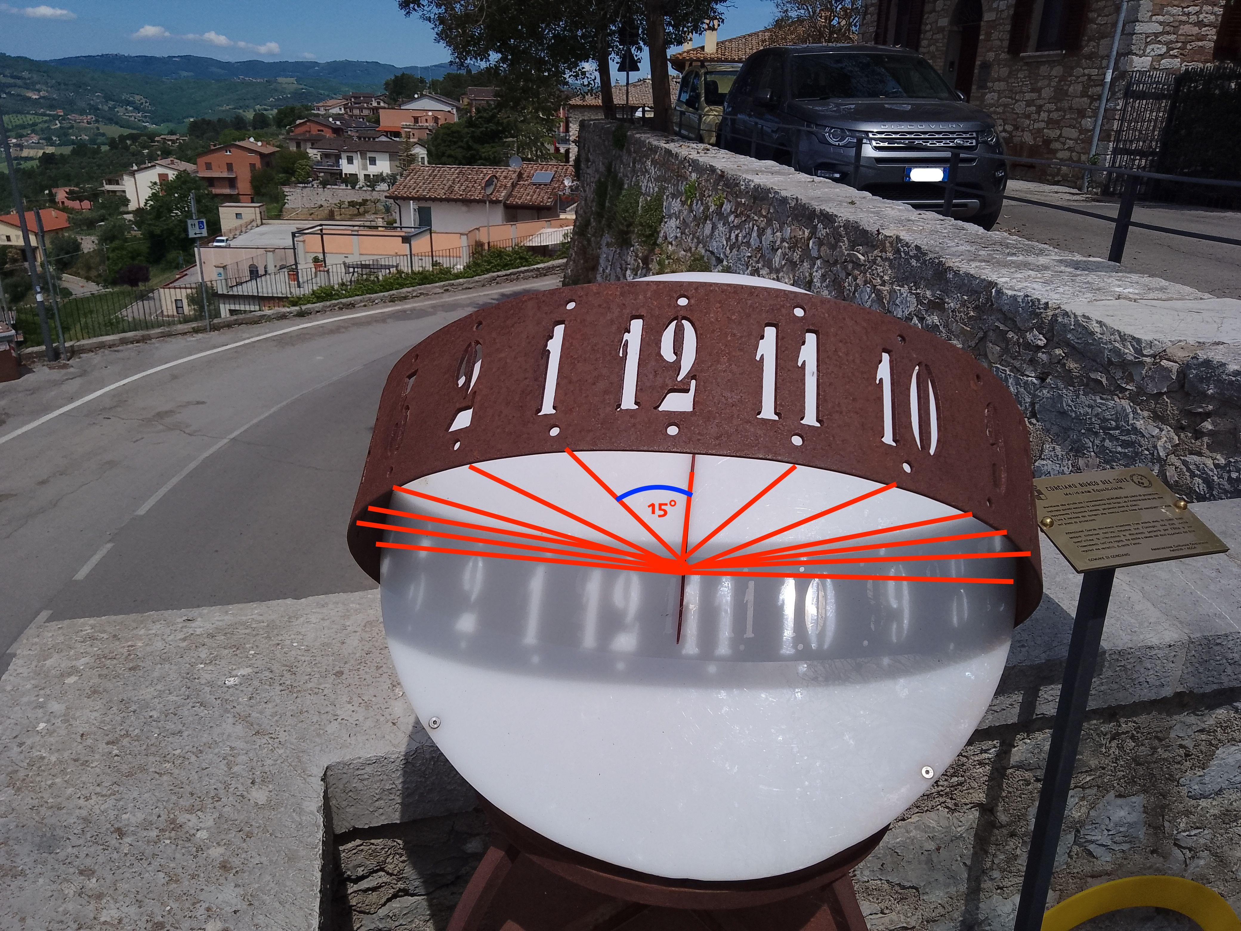 Nel modello qui realizzato il piano equatoriale è l’anello che riporta i numeri delle ore del giorno, mentre sul piano ad esso perpendicolare (la cui inclinazione corrisponde alla Latitudine di Corciano), è disegnata la linea meridiana in corrispondenza della quale si legge l’ora proiettata dal Sole!