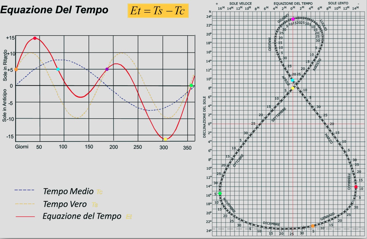 Questi anticipi e ritardi hanno una periodicità annuale che viene rappresentata con la curva ‘ad otto’ detta Analemma o Equazione del Tempo.