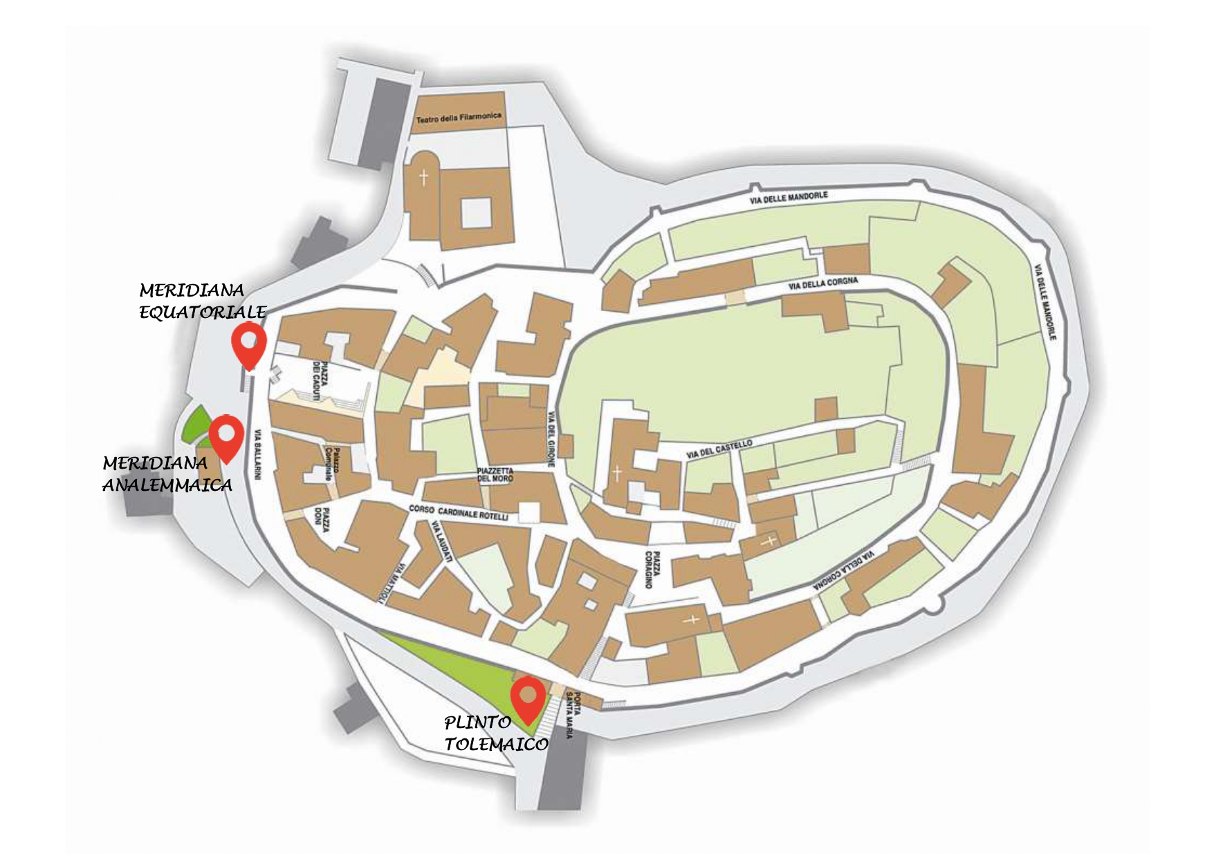 Il percorso, realizzato a seguito di un’attenta analisi delle caratteristiche geografiche e di esposizione al sole del borgo, propone attualmente una Meridiana Analemmatica orizzontale, collocata lungo via Cornaletto, sopra al parcheggio del Museo Antiquarium, per il funzionamento della quale, lo gnomone, e quindi l’ombra proiettata che indica l’ora, è la persona che usa la meridiana stessa, previa collocazione nel punto corretto dello strumento, indicato dal mese in cui si osserva; una Meridiana Equatoriale armillare, sita in cima alle scale che collegano il parcheggio del Museo Antiquarium con Via Ballarini, che permette sempre la misurazione dell’ora; e un Plinto tolemaico, collocato presso i giardini del Torrione di Porta Santa Maria, il cui gnomone proietta l’ombra di mezzogiorno su entrambe le facciate in modo da poter leggere l’altezza del sole e quindi il periodo dell’anno. Nel futuro il progetto potrebbe prevedere l’ampliamento del Parco con l’installazione di altri interessanti strumenti.