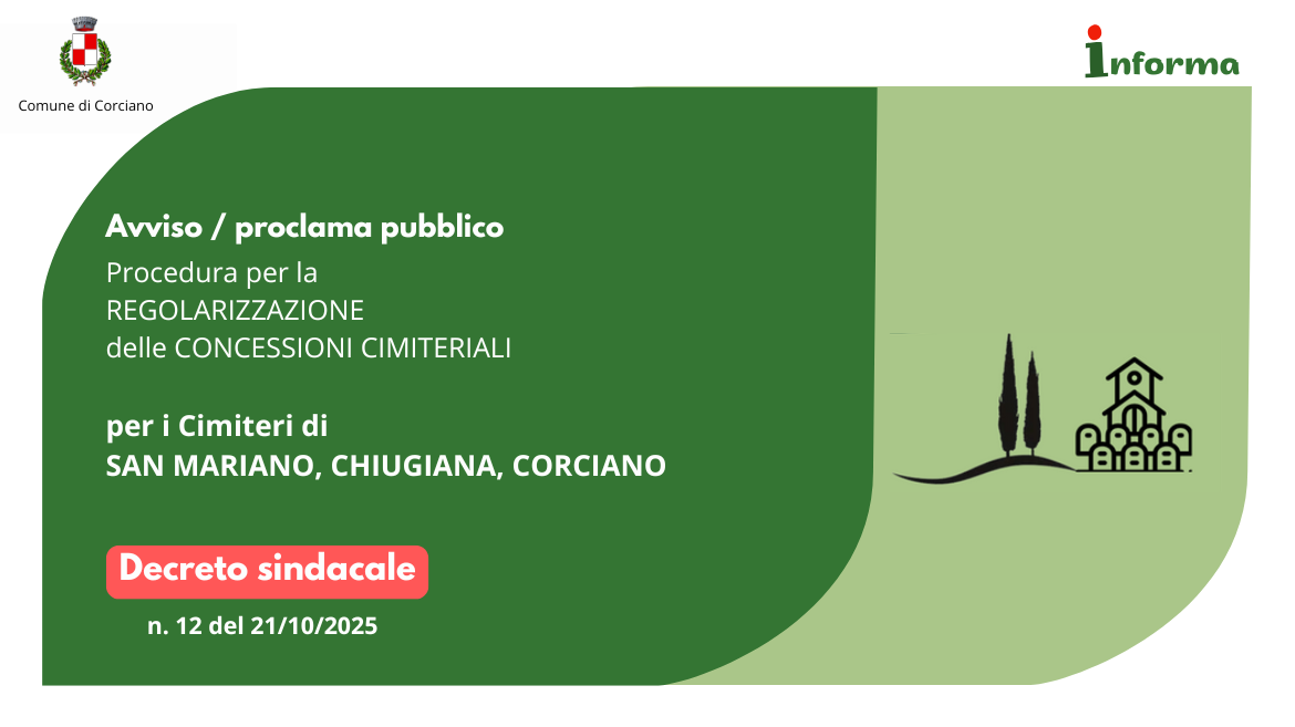 Con Decreto Sindacale n. 12 del 21/10/2025, Il Sindaco rende noto che su ogni tomba risultante priva di salma e di contratto di concessione è affisso, a partire dal 22/10/2025 e fino al 31/03/2026, un avviso/proclama pubblico.