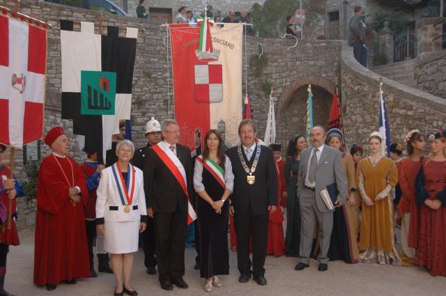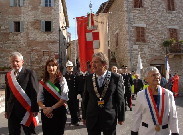 Il sindaco di Corciano Nadia Ginetti e il primo cittadino di Pentling Albert Rummel; il sindaco della cittadina francese cogemellata di Civrieux d’Azergues, Marielle Sigalas, e il collega della polacca Libianz (che presto si gemellerà con Corciano), Tadeus Arkit, hanno sfilato in corteo con assessori, consiglieri, autorità e le delegazioni dei cittadini delle rispettive città. Al solenne corteo ha fatto seguito la cerimonia vera e propria all’interno della chiesa –museo di San Francesco.