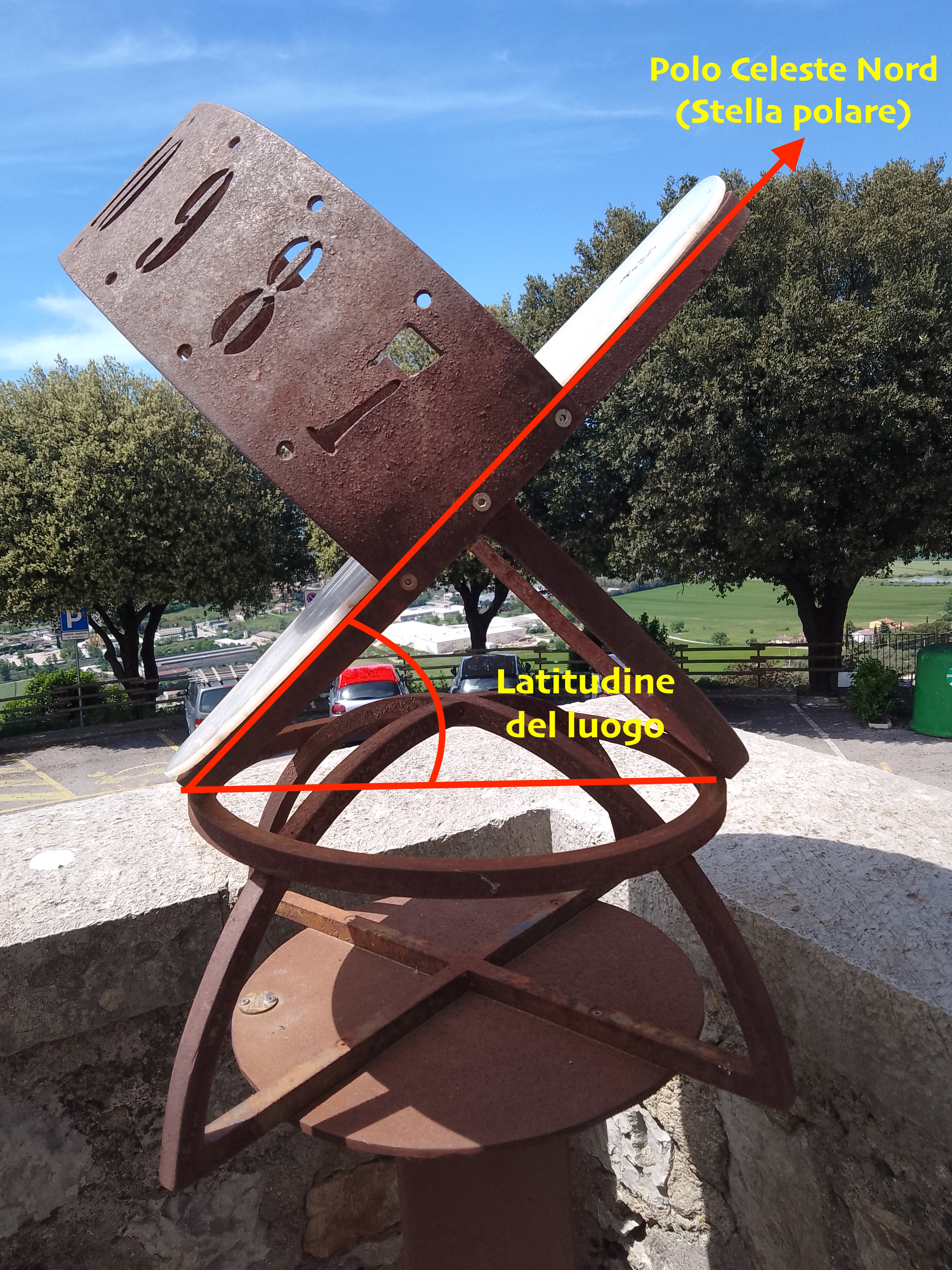 Nel modello qui realizzato il piano equatoriale è l’anello che riporta i numeri delle ore del giorno, mentre sul piano ad esso perpendicolare (la cui inclinazione corrisponde alla Latitudine di Corciano), è disegnata la linea meridiana in corrispondenza della quale si legge l’ora proiettata dal Sole!