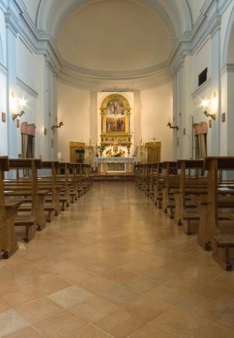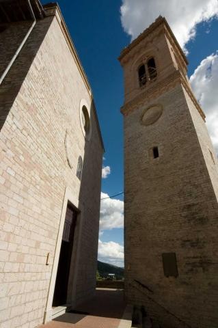 La iglesia es de estilo gótico pero, en 1870 según el proyecto del arquitecto Lardoni de Perugia, fue transformada de gótico a neoclásico.